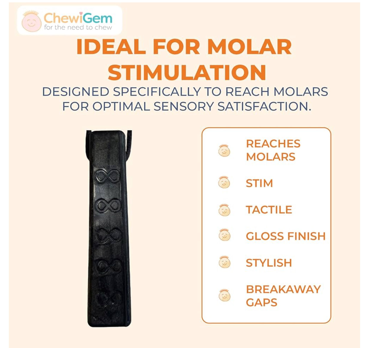 - For the Molar Chewer - The Infinity chew necklaces for sensory kids and adults support sensory needs of individuals with SPD & more. This chewlery necklace features a cuboid shape designed to reach back molars and provide soothing relief for your little chomper.