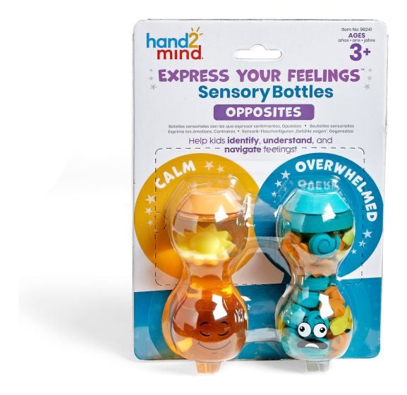 Two bottles, two feelings! Expand the social emotional learning of our original Express Your Feelings Sensory Bottles with the new opposites bottles. Add the Calm and Overwhelmed bottles to our other sets which are sold separately.