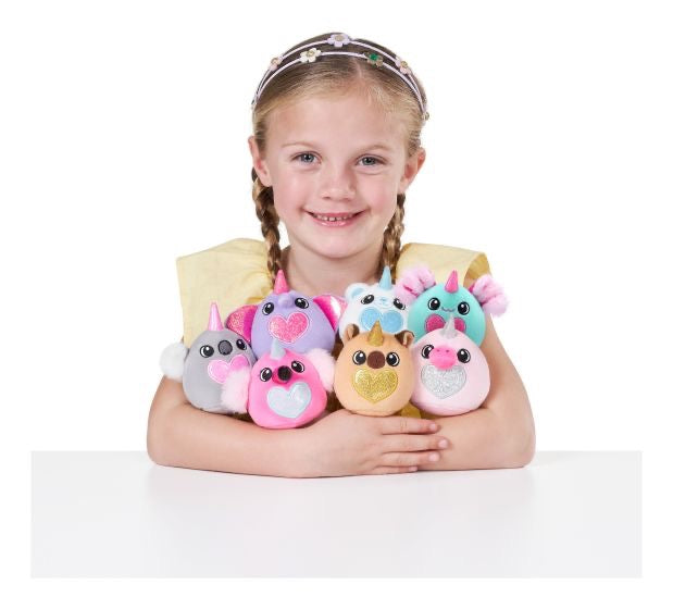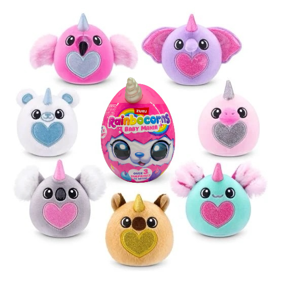 Life's always sunny side up in Eggzania! Your new baby Eggzanias feature glittery hearts on their tummies, adding a magical sparkle. Collect all seven super soft, cuddly plushes, and mark them off on your collector's guide. Can you discover the rare Baby Eggzania? Rainbocorns are the ultimate surprise eggs, blending mystery unboxing with quirky surprises. In Rainboville, magic unfolds with every egg, and the excitement never stops!